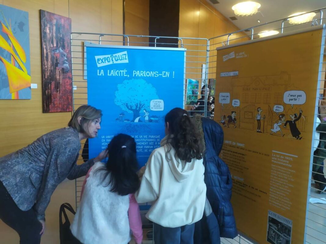 La matinée du 8 décembre, après les discours, deux classes (des CM2 de l’Ecole Bayet et des 6e du Collège Jean Zay) ont participé à deux escape game ainsi qu’un quizz sur une exposition laïcité. Certains militants des associations du Collectif Laïcité présentaient des panneaux de l’exposition. La Licra Drôme était venue en force avec Jean-François, notre président, et Christiane notre responsable éducation, accompagnés de Marie, coordinatrice.