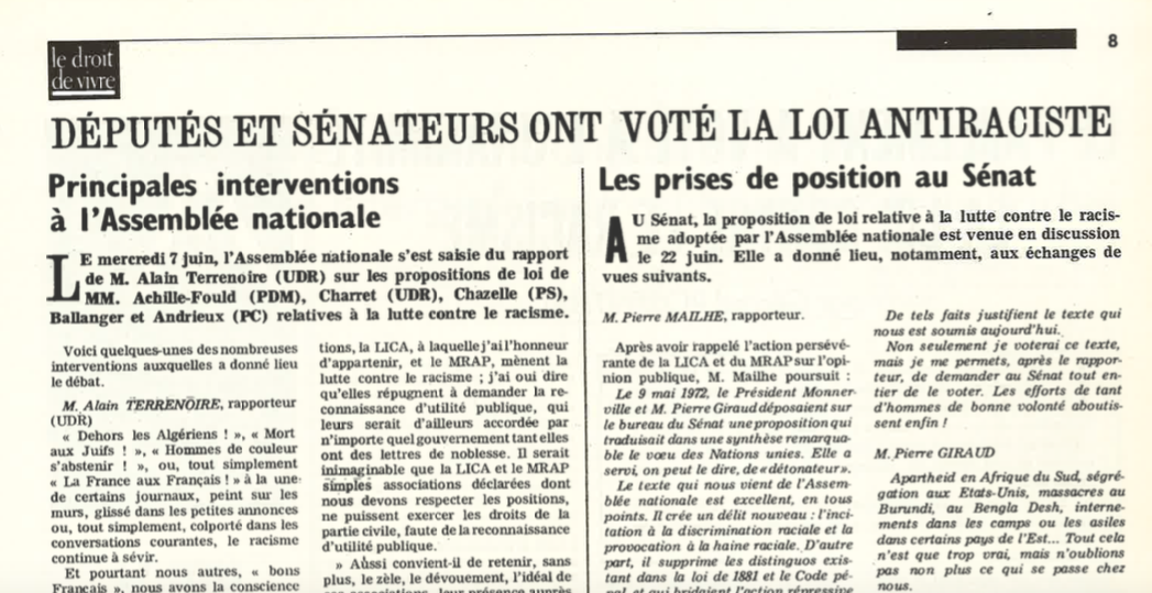 Entre 1944 et 1972, plusieurs tentatives de renforcement de la législation antiraciste sont proposées au Parlement mais n’aboutissent pas. La ratification de la Convention Internationale sur l’élimination de toutes les formes de discrimination raciale, adoptée par l’ONU en 1965, va offrir à la France l’occasion de consolider l’arsenal juridique contre l’expression du racisme et de l’antisémitisme. Le 1er juillet 1972, la loi Pléven, du nom du garde des Sceaux du gouvernement de Jacques Chaban-Delmas, est promulguée après un vote unanime du Sénat et de l’Assemblée Nationale. Cette loi crée un nouveau délit : celui de “provocation à la haine, à la discrimination ou à la violence” puni à l’époque d’un mois à un an d’emprisonnement et d’une amende de 300 000 francs au maximum. La loi Pléven intègre également de nouvelles dimensions jusque-là inexplorées en punissant les discriminations raciales dans les domaines du travail et du logement. Elle modifie la loi du 10 janvier 1936 sur les groupes de combat et milices privées et permet de dissoudre des groupes incitant à la haine raciale. Enfin, elle reconnaît la faculté aux associations antiracistes de plus de cinq ans de se constituer partie civile. Robert Badinter, alors avocat de la Licra, se saisira très vite de cette disposition pour plaider contre l’édition non-critique de « Mein Kampf » par les Nouvelles éditions latines ou encore la publication des « Protocoles des sages de Sion ».