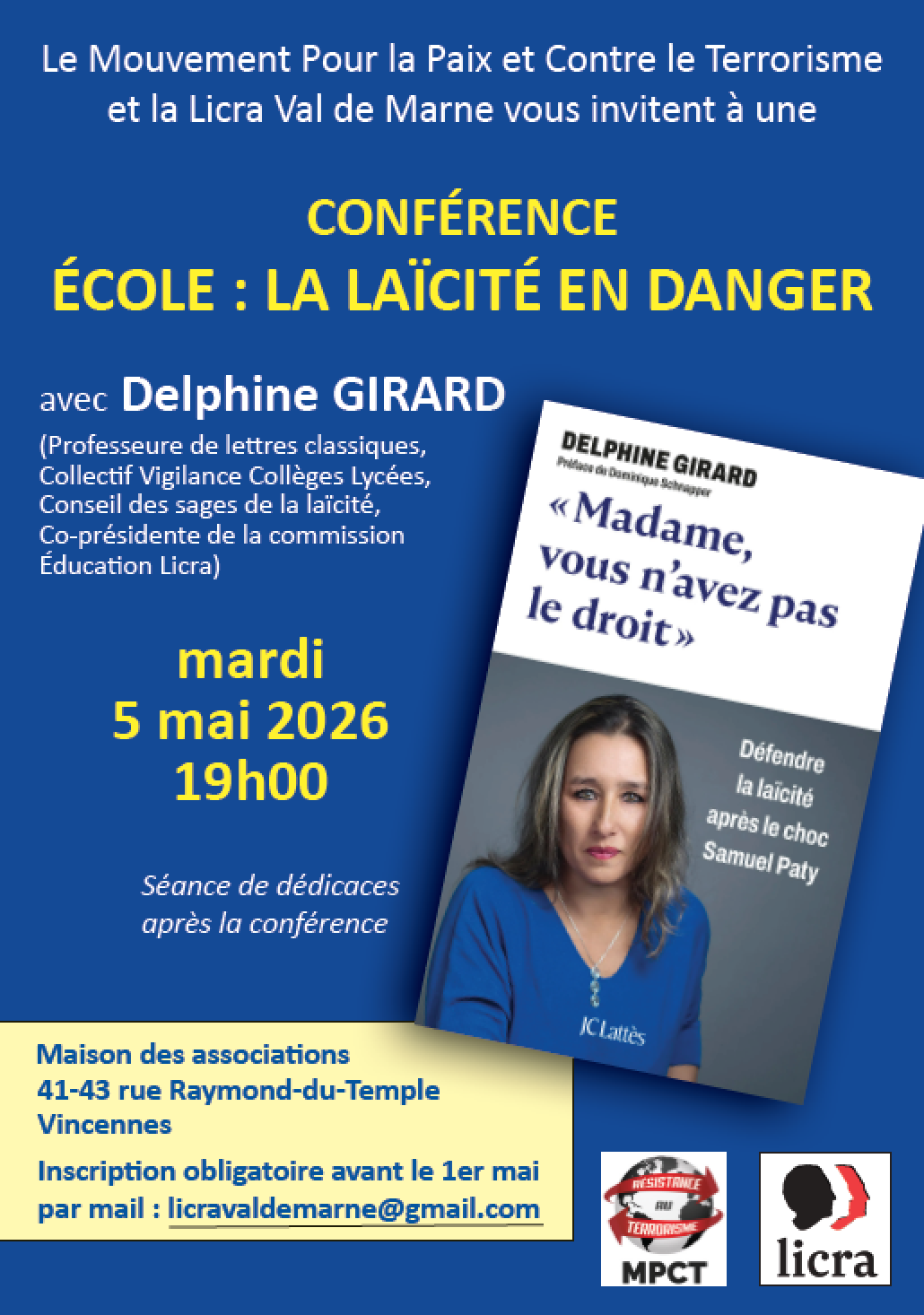 Licra Val de Marne : Conférence de Delphine Girard le 5 mai 2026 – École : la laïcité en danger