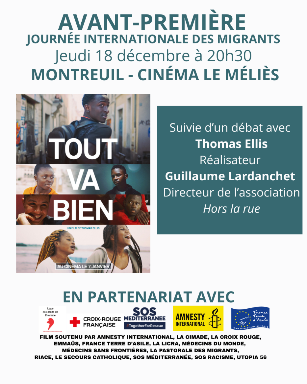 À l’occasion de la Journée internationale des migrants, le film Tout va bien de Thomas Ellis sera présenté en avant-première le jeudi 18 décembre à 20h30 au cinéma Le Méliès à Montreuil.
